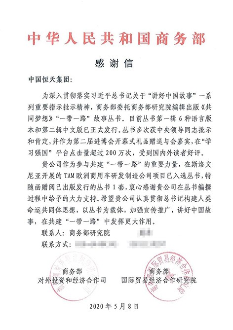 作者:衡阳智电客车时间:20-12-16为感谢恒天集团下属企业TAM欧洲商用车研发制造公司,在商务部研究院编辑出版《共同梦想》“一带一路”故事丛书过程中给予的大力支持,中华人民共和国商务部特地发来感谢信以示表扬和感谢,并赠书1套。恒天集团将认真贯彻总书记构建人类命运共同体思想,以丛书为载体,加强宣传推广,讲好“中国故事”,在共建“一带一路”中发挥更大作用。
